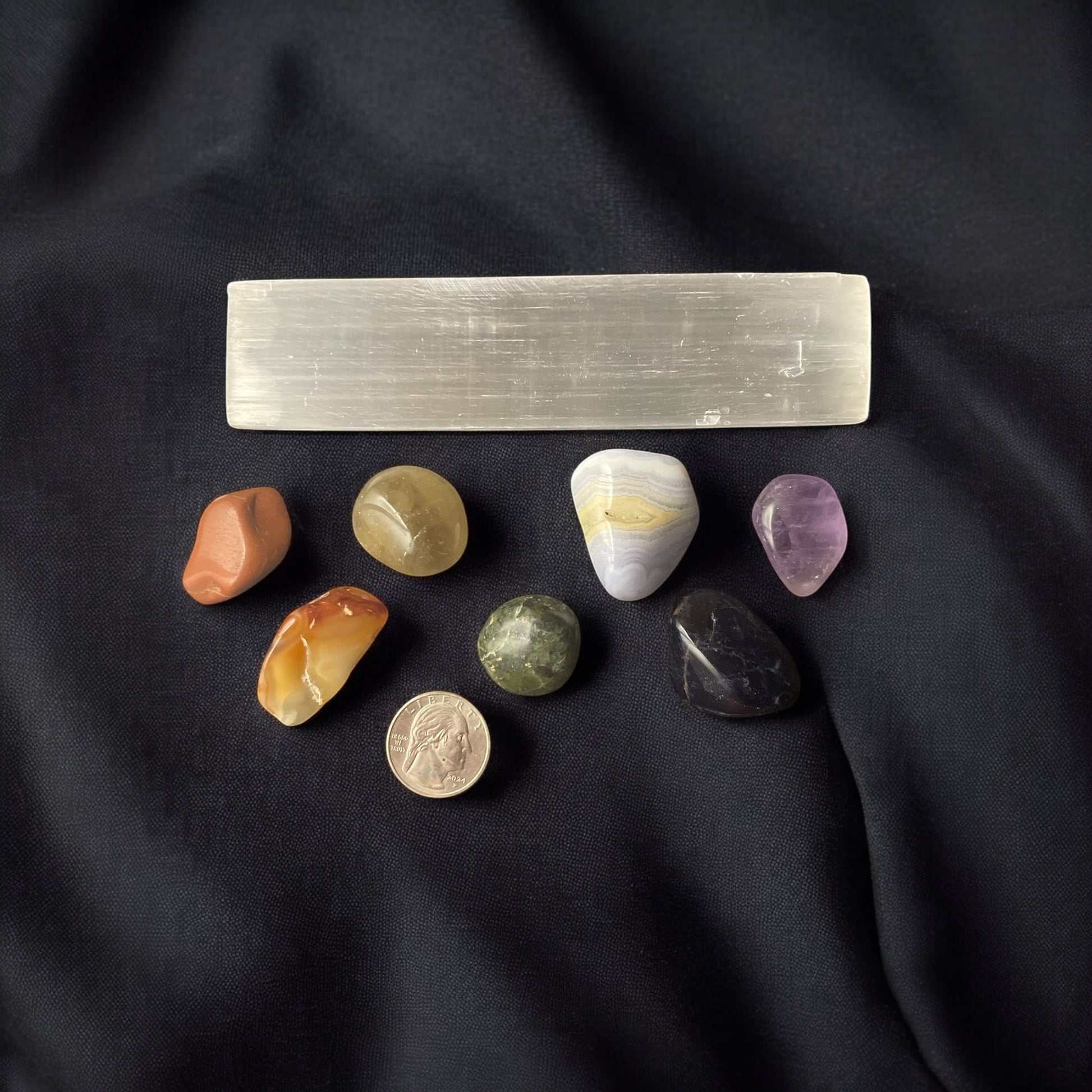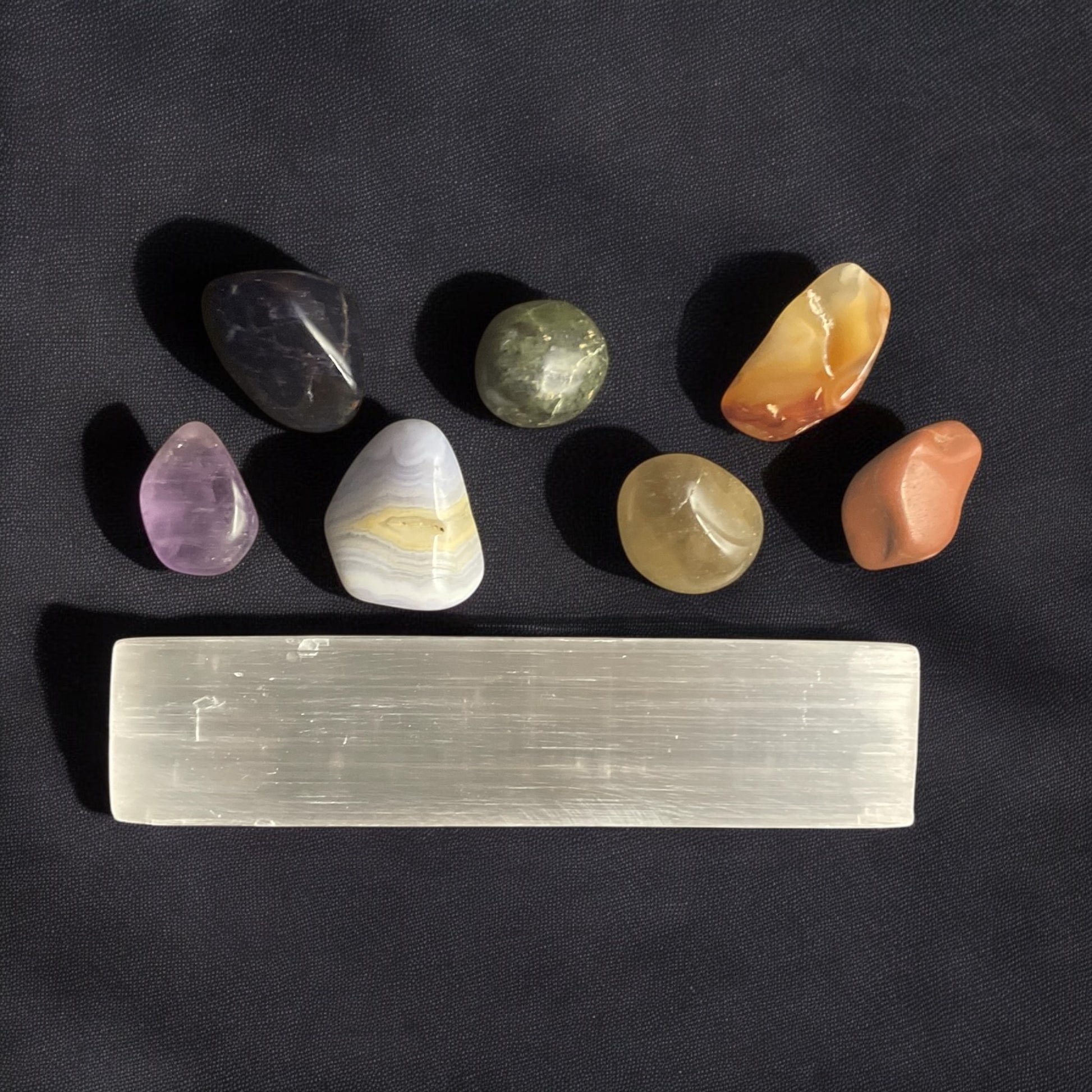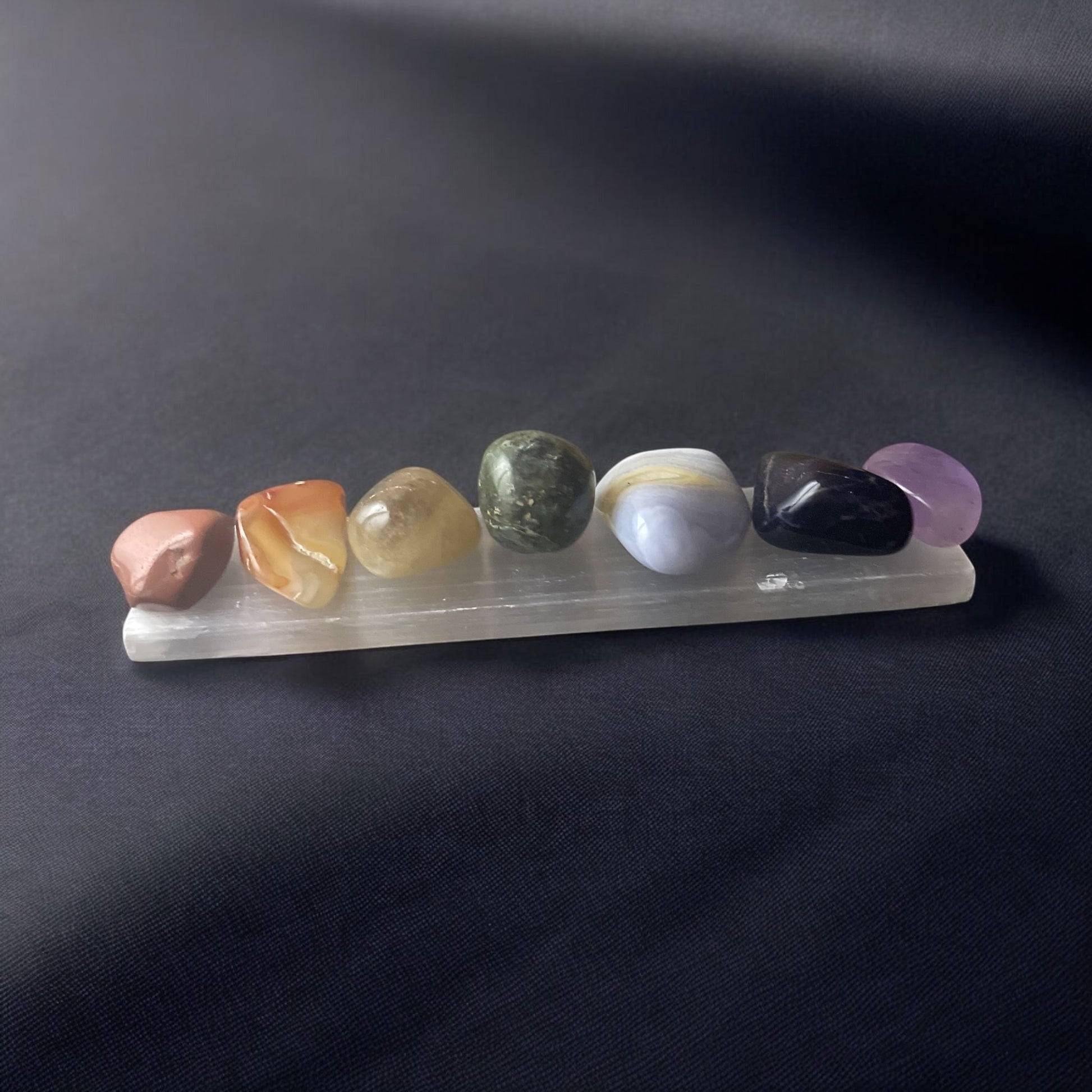 This crystal chakra set includes all of the essential stones to balance and align the 7 chakras promoting overall physical, emotional, and spiritual well-being. Each stone corresponds to a specific chakra, providing unique benefits for healing and rejuvenation. Experience the power of crystals with this expertly curated set. The set includes 7 tumbled / hand polished stones and a Selenite Bar for charging your Crystals.